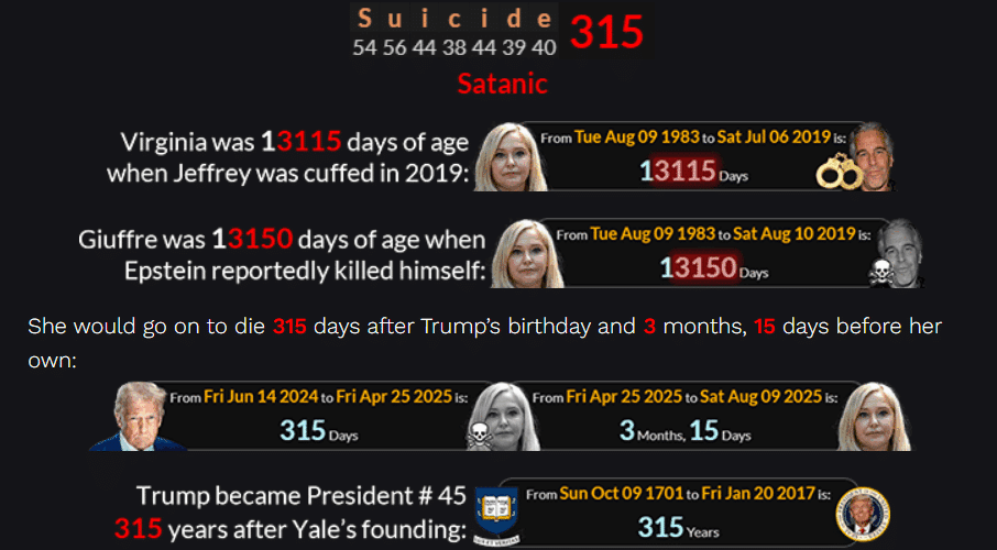 Jump to: Date Numerology • “Suicide” • Skull and Bones • The Pi Code • More Notes Date Numerology / Eclipse Code See my post from 2018 on the death of Jeffrey Epstein. It was primarily a riddle for the Moon – Epstein’s last birthday was on the date of a Total Lunar Eclipse. Virginia Giuffre … Continue reading Epstein Accuser Virginia Giuffre Gets Suicided @ Age 41