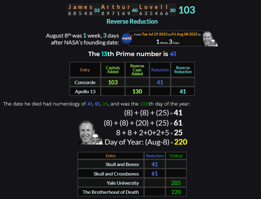 James Arthur Lovell was the mission commander of Apollo 13. Skull & Bones = 130.