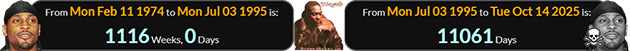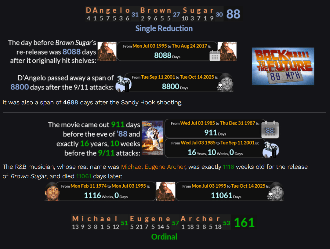 The R&B musician, whose real name was Michael Eugene Archer, was exactly 1116 weeks old for the release of Brown Sugar, and died 11061 days later: