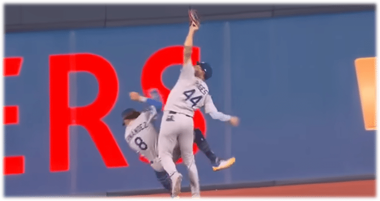 With the bases loaded and 2 outs in the bottom of the 9th, a fly ball was hit to deep left field, but Andy Pages made the catch to send the game into extra innings. The dramatic play ended with #8 colliding into #44: