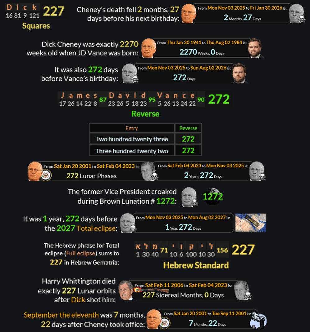 Whittington died 272 Lunar phases after Cheney became VP and 2 years, 272 days before he died: