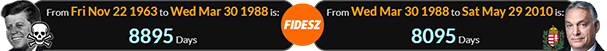 The formation of the Fidesz party was 8895 days after JFK’s assassination and 8095 days before Orbán’s second premiership began:
