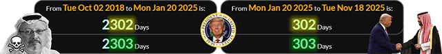 Trump took office 2,302days (or 2,303 w/ end date) after Jamal Khashoggi was murdered, and met with Mohammed bin Salman 302 days (or 303) later: