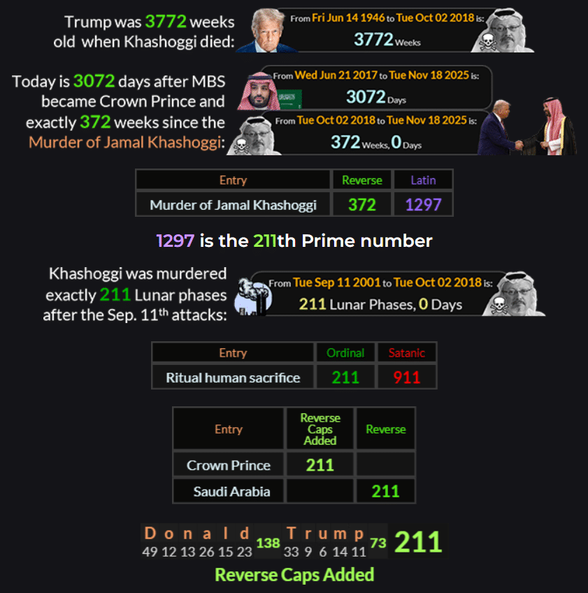 Both Human sacrifice and Blood sacrifice sum to 76, a number connected to Skull and Bones, and Jamal Khashoggi, Donald John Trump, and Mohammed bin Salman.