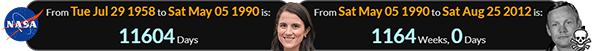 She was born a span of 11604 days after NASA was founded, and Neil Armstrong died exactly 1164 weeks later: