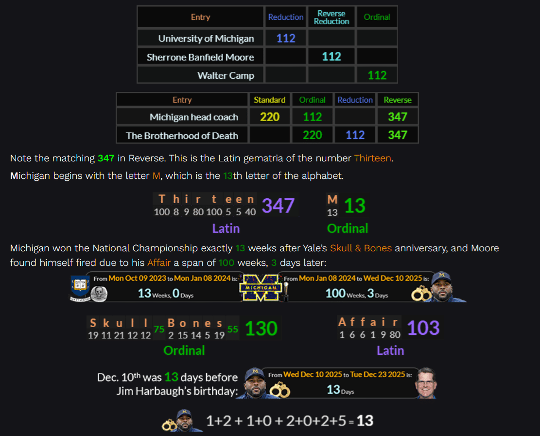Michigan won the National Championship exactly 13 weeks after Yale’s Skull & Bones anniversary, and Moore found himself fired due to his Affair a span of 100 weeks, 3 days later:Harbaugh led Michigan to a championship exactly 13 weeks after Yale’s ‘Skull & Bones’ anniversary: