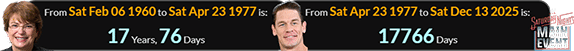 Cena was born 17 years, 76 days after Brown’s president and was 17766 days old for his last match: