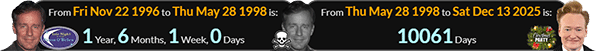 Hartman appeared on Late Night w/ Conan O’Brien a span of exactly 1 year, 6 months, 1 week before he died, and Conan’s Christmas party was 10061 days later: