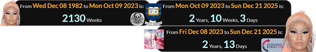 Nicki’s appearance was 2 years, 13 days after her last album and 2 years, 10 weeks, 3 days after Yale’s ‘Skull & Bones’ anniversary, which she was 2130 days old for: