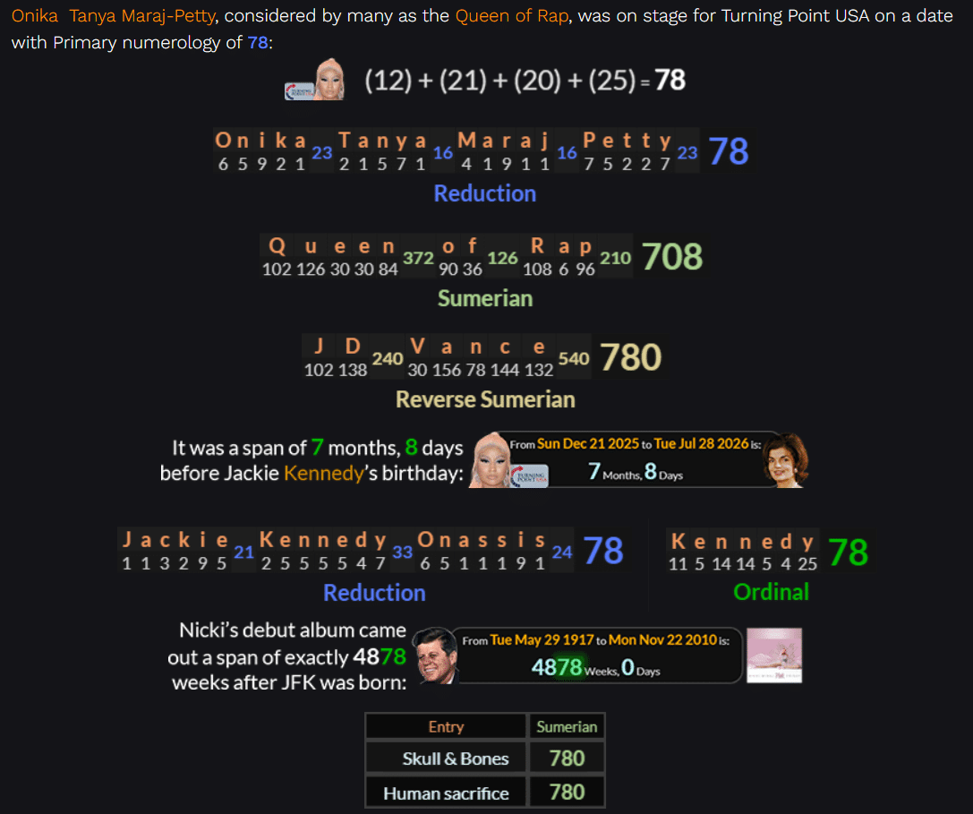 Onika Tanya Maraj-Petty, considered by many as the Queen of Rap, was on stage for Turning Point USA on a date with Primary numerology of 78:![]()