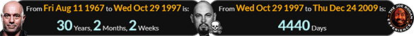 Anton LaVey died 30 years, 2 months, 2 weeks after Joe Rogan was born and a span of 4440 days before he launched his podcast: