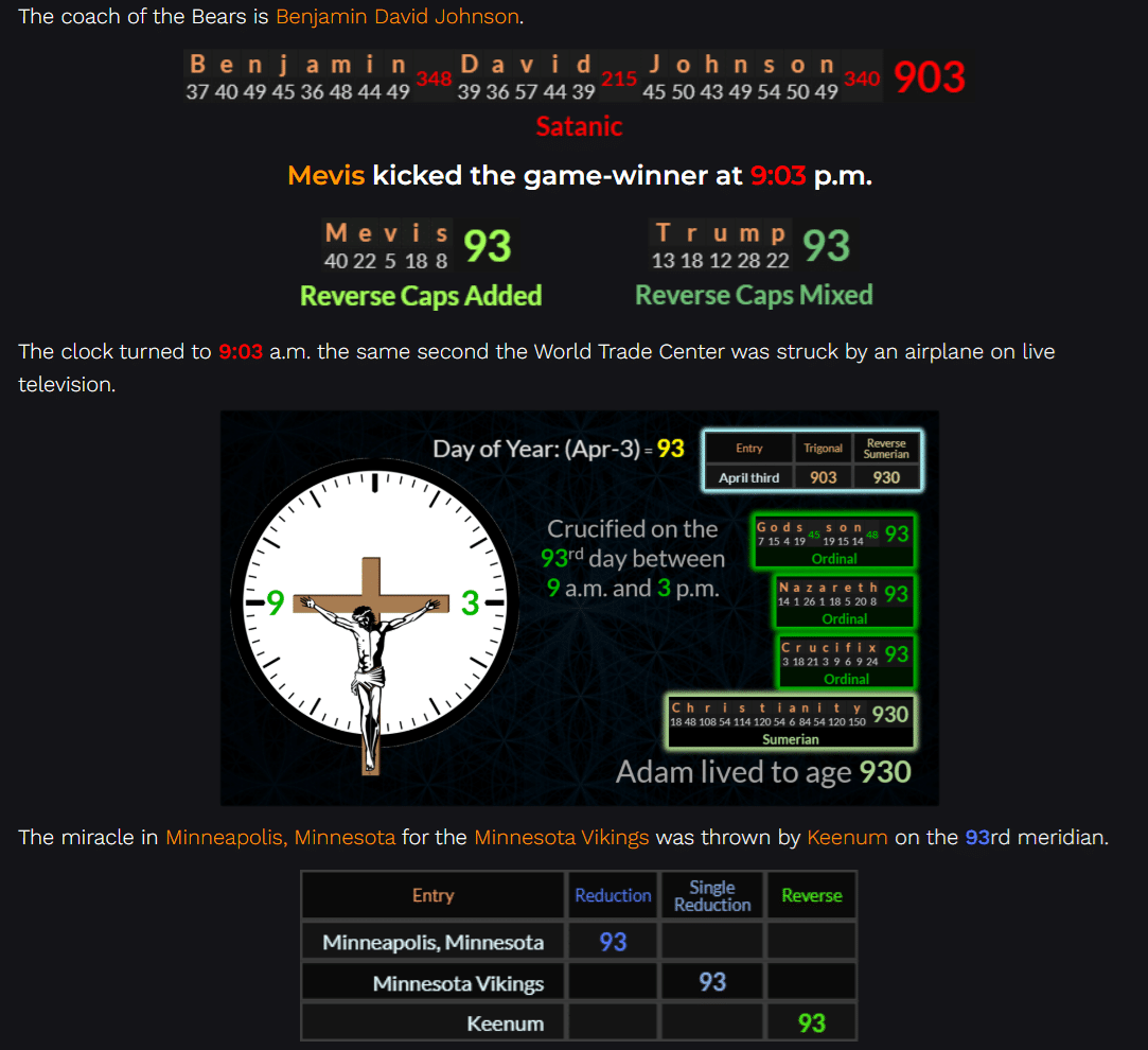 Chicago’s (short-lived) hero was Cole Kmet, who received a pass from Williams. They have matching 84 gematria with Minnesota’s hero, Diggs.