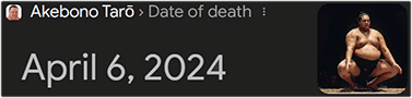 Standing over 500 pounds, Akebono, born as Chadwick Rowan, was one of the largest rikishi to ever compete in Makuuchi. Unfortunately, humans that size typically do not live to be very old, for obvious reasons. After several years of battling health issues, he died in April 2024 on a date with Primary numerology of Fifty-four (54):![]()