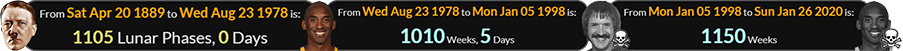 Kobe was born exactly 1105 Lunar phases after Hitler, was 1010 weeks, 5 days old when Sonny Bono died, and suffered his own demise 1150 weeks later: