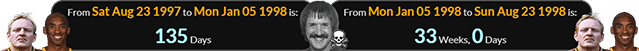 Sonny Bono died in a Skiing accident 135 days after Jurgensen and Kobe’s date of birth, and a span of exactly 33 weeks before their next:
