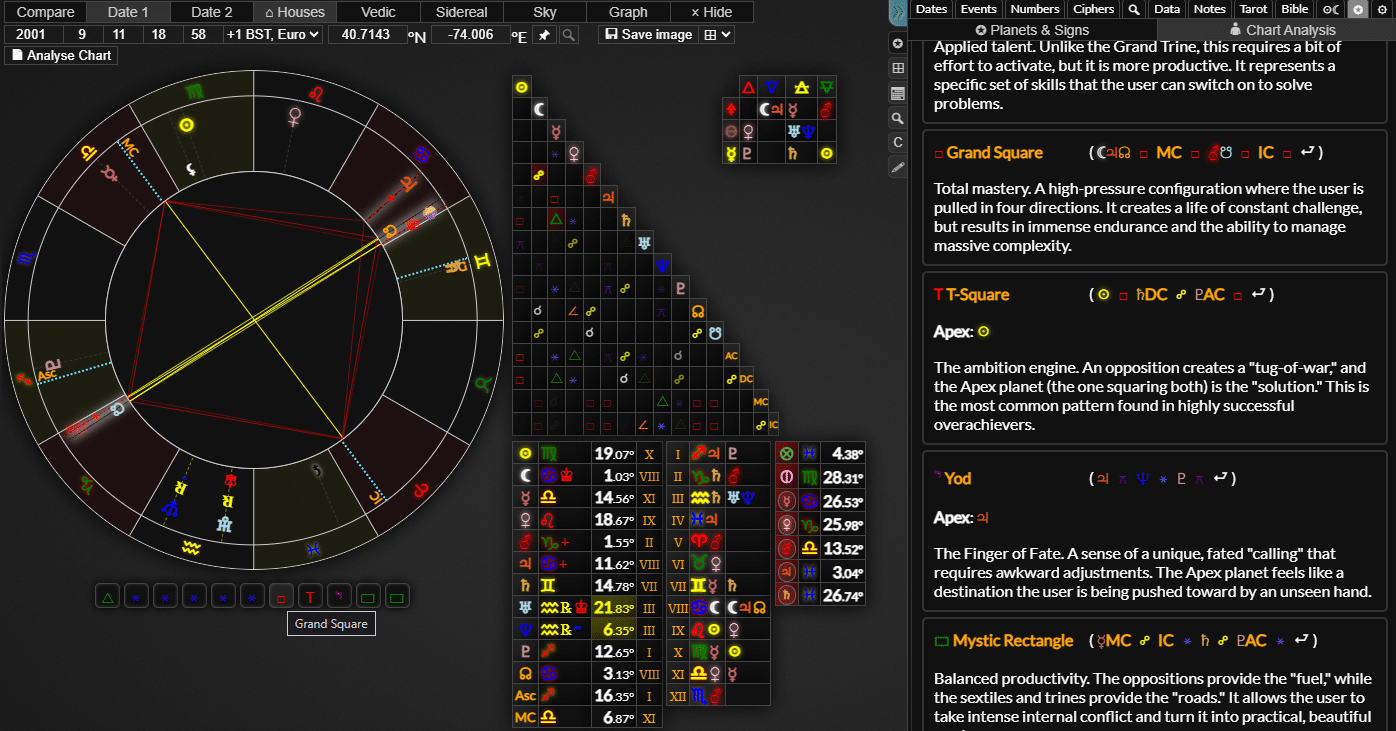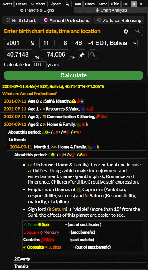This is the kind of information you would get from an astrology consultation, at your fingertips, for any chart, at the click of a button. This will also teach you astrology and help those new to it start integrating it into their research and decodes.