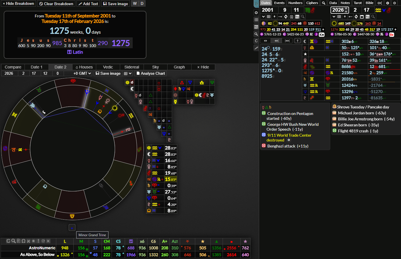 You can now also right click and shift+right click bible verses and astrology features in the dates panel, calendar, astrology panel etc. to add them to the breakdown area. Remember, you can also right click and shift+right click date spans, date numerology, gematria values and number sequences to create integrated decodes from various kinds of information and save them as an image.