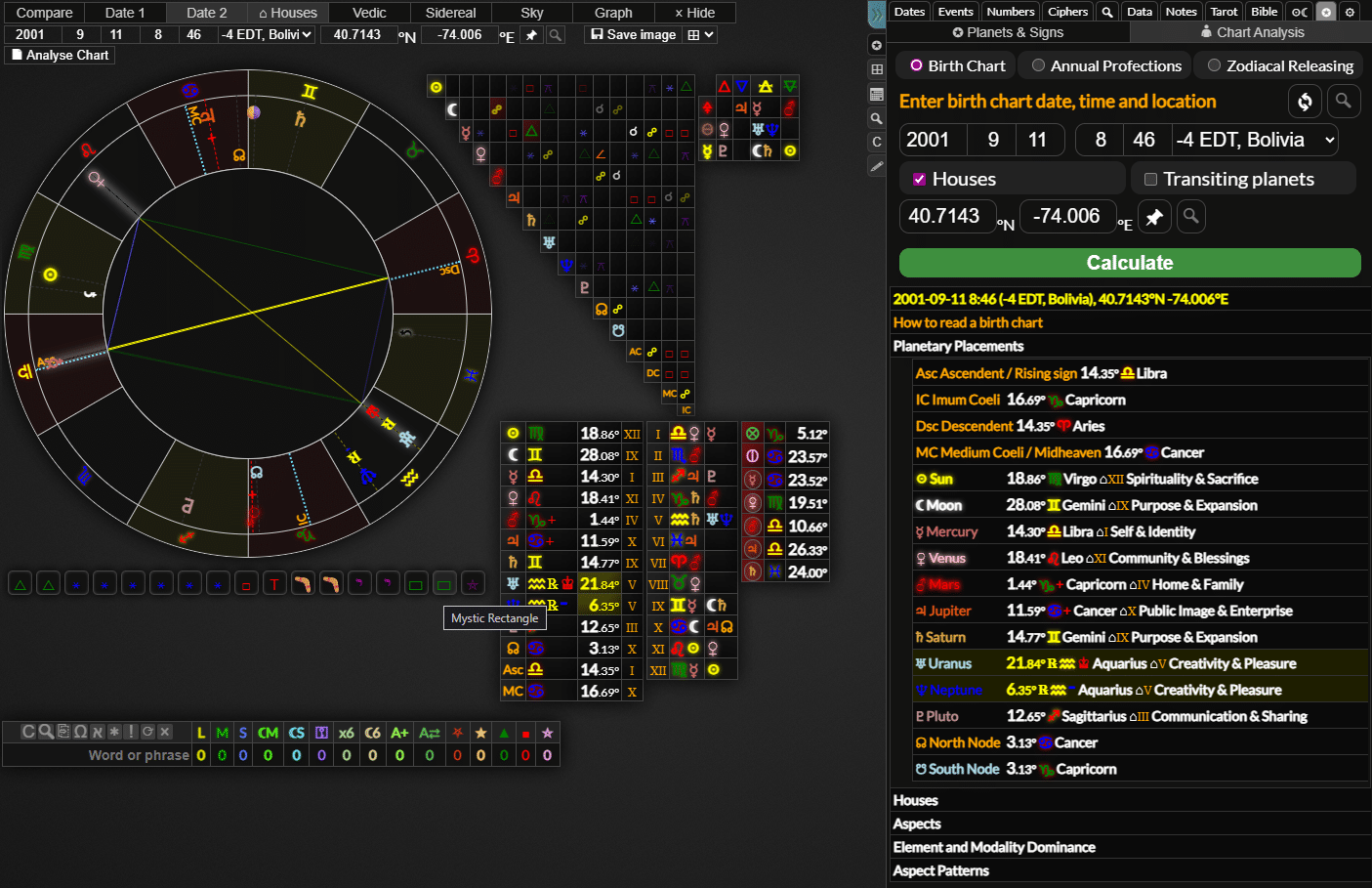There are many tools for visualizing whatever it is you are decoding, such as astrology graphs – instantly accessible by simply right clicking the astrology tables – sky view, Vedic and sidereal charts, the date grid, gematria match table, calendar view, date span breakdowns for all planets, date numerology for the Gregorian, Hebrew, Islamic and Julian calendars, moon phases, eclipses and lunation numbers, the list of features goes on and on. It also features a complete Bible, eclipse and tarot reference, a notepad, information about each planet and zodiac sign combination and how planets interact with each other.