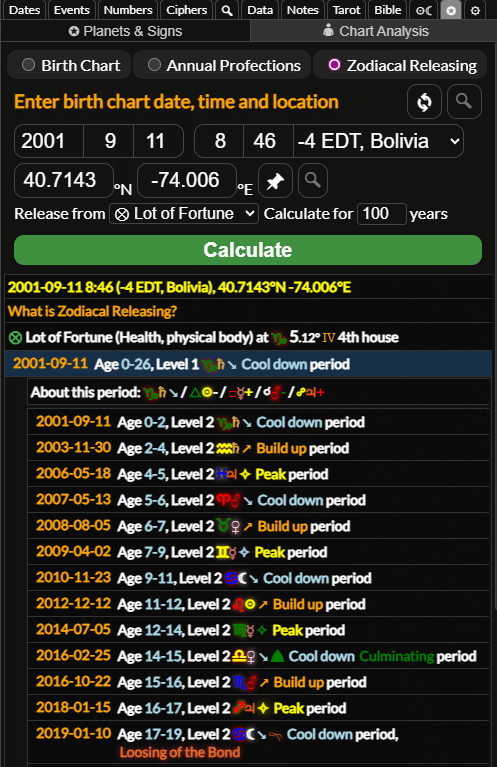 Zodiacal releasing involves the calculation of “lots” based on your birth chart, which rule different areas of your life and affect how zodiacal releasing periods are calculated. You can opt to choose or hide these from the chart in the settings and there is a new table next to the astrology chart that will show where these lots are and the current zodiacal releasing periods for whatever date you enter. There are also explanations for each of these in the calculator.