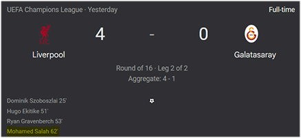 Notice how Mohamed Salah from Egypt scored in the 62nd minute of the game.