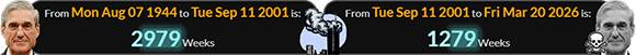 Mueller became the FBI Director exactly one week before September 11th, 2001. He turned 2,979 weeks old just one day before the attacks, and died 1279 weeks later: