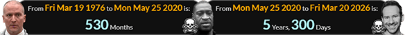 He died a span of 5 years, 300 days after George Floyd, whose death occurred when Derek Chauvin was 530 months old: