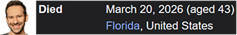 Radvinsky, who was 1006 weeks old for the 9/11 attacks, died at 16,000 days of age, and news of his death broke on a 16 date:![]()