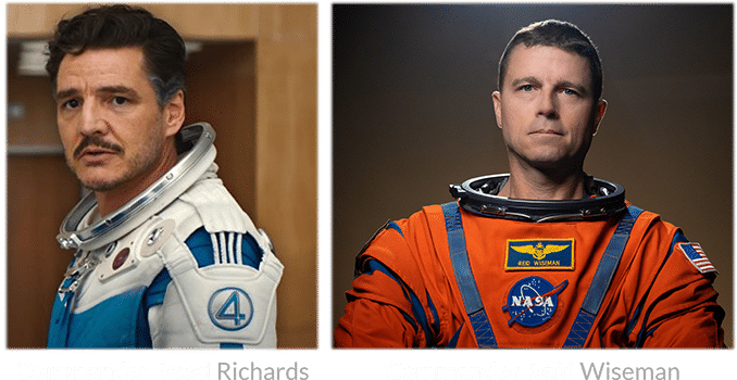 Fantastic Four features a space-traveling intergender crew of four led by character named Commander Reed Richards, a.k.a. Mister Fantastic, played by Pedro Pascal. Meanwhile, Artemis II features a space-traveling intergender crew of four led by Commander Reid Wiseman: