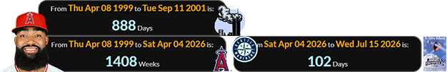 Adell was 888 days old for September 11th and 1408 weeks old for the game on April 4th, which was 102 days before Angels in the Outfield‘s anniversary: