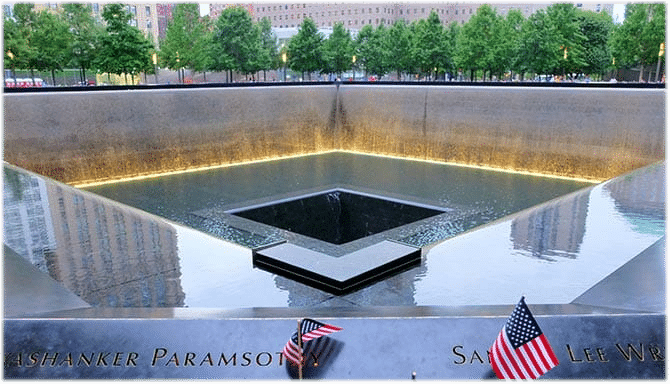 The World Trade Center memorial is a clear tribute to the bottomless pit, as water appears to trickle into the abyss at the footprint of each of the Twin Towers: