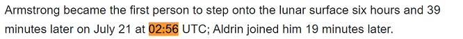 Neil Armstrong first set foot on the lunar surface at 2:56 UTC:
