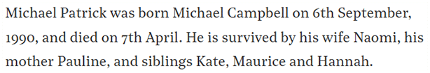 Michael’s obituary mentions another intriguing detail – his surname at birth was not Patrick, but Campbell: