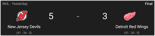 After the game in Detroit, both the Devils and Red Wings stood at 41 total wins on the season: