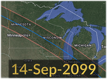 On the current Pope’s birthday in 2099, a Total Solar Eclipse passes over Wisconsin: