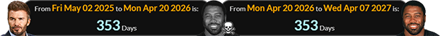 April 20th was 353 days after David Beckham’s birthday and a span of 353 days before Rod Martin’s: