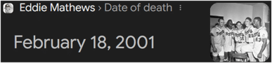 Eddie Mathews died on February 18th, or 2/18, of 2001 – the same year as the terror attacks of 11/9/01: