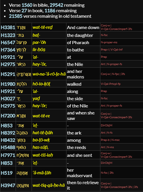 Below the translations is some information about where the verse is in the Bible. Below that is the interlinear table, where you can see the original text with its pronunciation and translation word by word. You can click the Strong's reference number on the left to view more information about it.