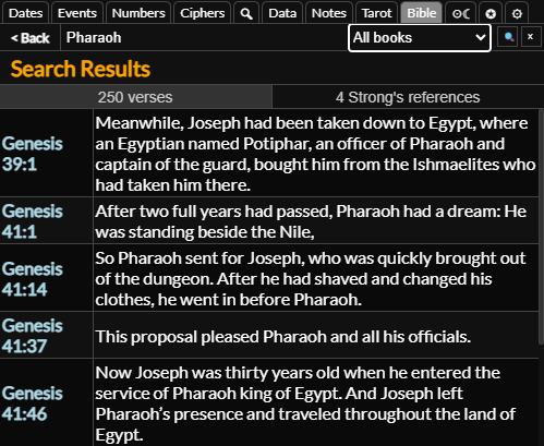 You can also navigate to a Strong's entry using the Bible reference in the numbers tab to look up a Strong's entry by number. Simple navigate to the numbers tab, open the Bible reference section using the button at the top and then click . You can also select a book from the dropdown to load related verses within that book.