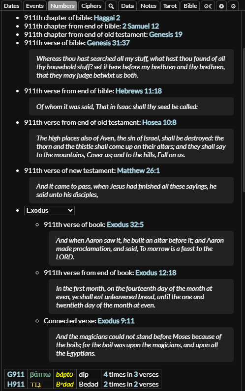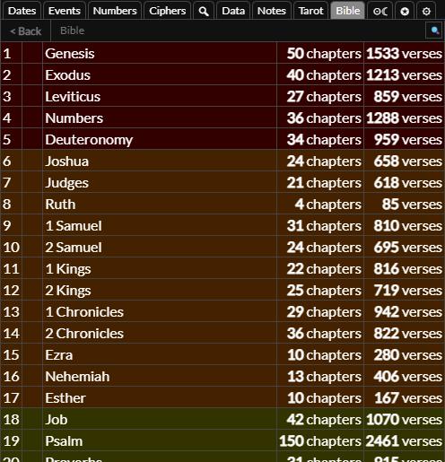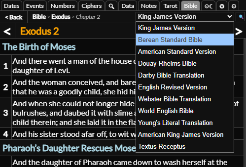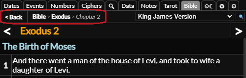 To navigate to the Bible tab you can click the tab in the side panel or use the keyboard shortcut. You can open up a Bible chapter or verse from the gematria calculator by typing the chapter or verse in the format "Revelation 22", "rev 22", "Revelation 22:21", "rev 22:21" and pressing .