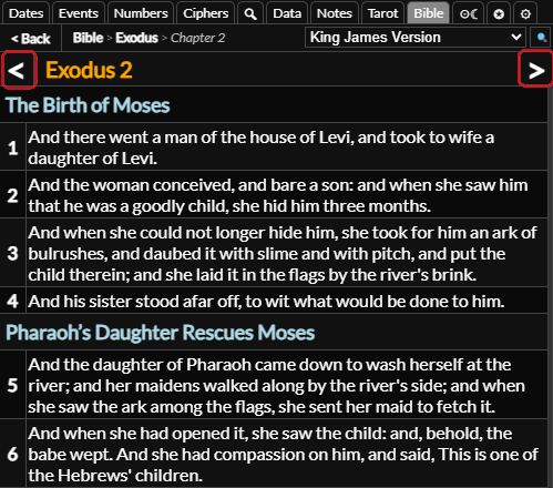 You can then click on a chapter to open it up. You can use the and buttons at the top to go to the next or previous chapter or verse. You can click a verse to open it.