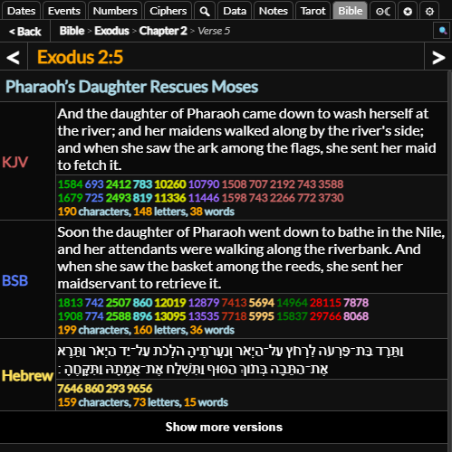 Beneath each translation you will see a list of gematria for the verse when written out on its own and with the verse name in front of it. You can the text to open it in the gematria table and it to open it with the verse name at the beginning.