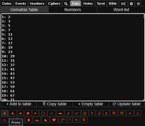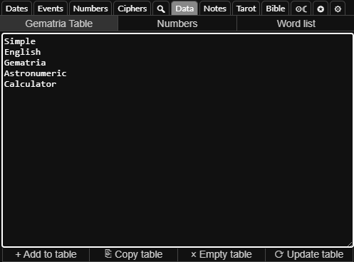 The data tab can be used to easily manage the gematria table, view the words you have entered in to the database and the number information you have saved in the numbers tab. To navigate to the data tab you ca click the tab in the side panel or use the keyboard shortcut. You can also open the data tab by clicking the copy table button on the gematria table or by clicking the name of a numerical sequence in the numbers tab.