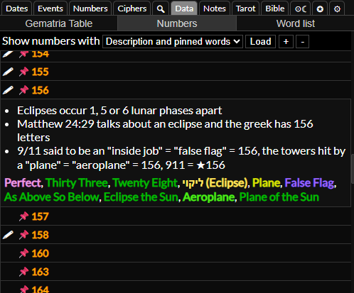 If you click the numbers sub-tab you will see a list of numbers about which you have saved information in the numbers tab. From the dropdown, you can select to list numbers that you have saved notes about, numbers that you have pinned words for or numbers that you have either saved notes about or pinned words for, then click the button to load the list. To view the information about the number you can click the list item to toggle it open or closed. The and buttons allow you to expand or collapse all numbers in the list.