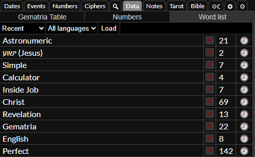 If you click the word list sub-tab you can see a list of all the words you have entered into the database. You can use the dropdown menu to order by most recently entered words, oldest, most commonly entered words or least commonly entered words. You can also filter words by language, so only words that have gematria in a cipher in that language will show. Simply select the options you want from the dropdown and click the button to load the list.