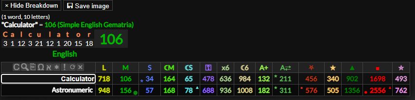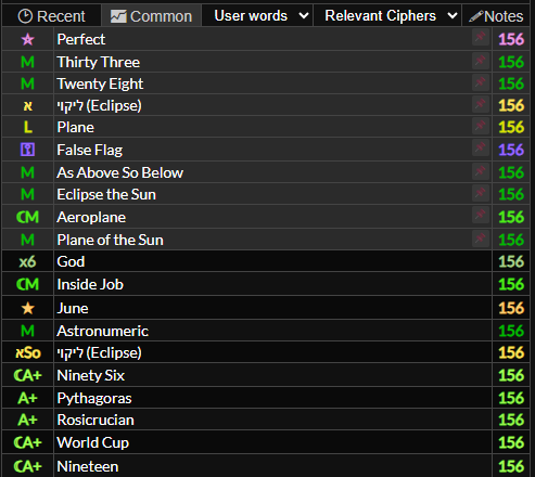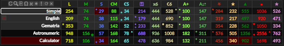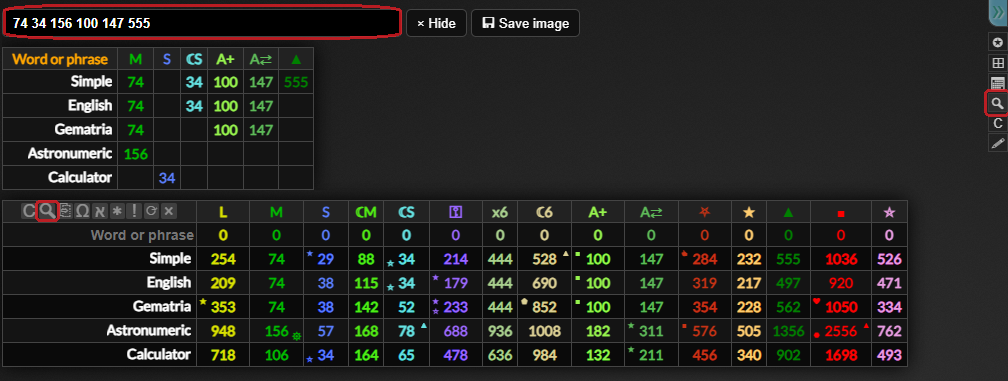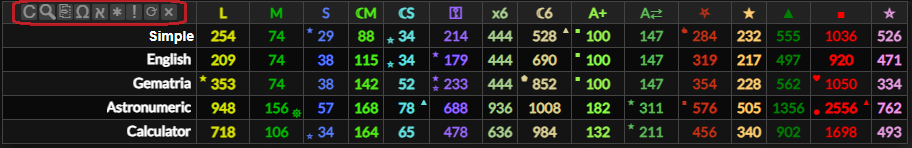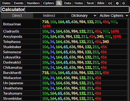 If you hover over a word or value in the gematria table it will highlight words and gematria values that match it. If they are indirect matches (different cipher) or are numerologically connected they will highlight in red. This will also highlight matching numbers in the dates tab, and you can hover over numbers in the dates tab to match them to the gematria table too.