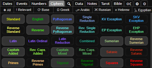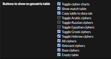 If you click one of the language buttons it will activate all the ciphers for that language or deactivate them if they are all active. If you one of these buttons it will also deactivate all the other ciphers, so if you the Greek button it will only show the Greek ciphers. You can press while focused on the gematria table input to tab through these buttons on the keyboard and press to activate them.