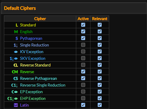 In the settings tab you can also set ciphers to be "relevant" or not. This determines which gematria values will show in the numbers tab; gematria values in ciphers you set as relevant will show first. You can click the button on the gematria table to show relevant ciphers.
