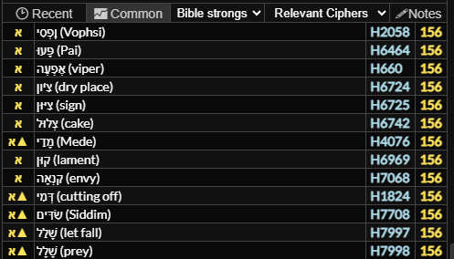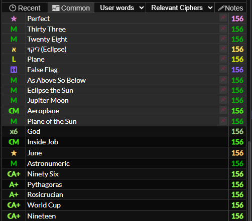 You can select which ciphers you want to view gematria values for. Relevant ciphers will show words with gematria values in ciphers you have set as "relevant" in the settings tab. Active ciphers will show ciphers currently active in the calculator, base ciphers will show ciphers set as default active and all ciphers will show words with matching gematria in any cipher.