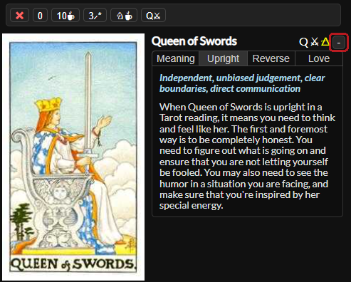 To create a spread you can click the button on a card and it will then be added to the spread. An area will pop up above the card showing the cards currently in the spread. To remove a card from the spread, click on it and then press the button in the top right of the card. You can hide the tarot spread by clicking the red button.
