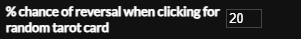 You can click the button to show a random card. To simulate drawing a card from a real tarot deck there is a certain percentage chance that the card you draw will be in reverse. You can set the percentage chance in the settings tab.